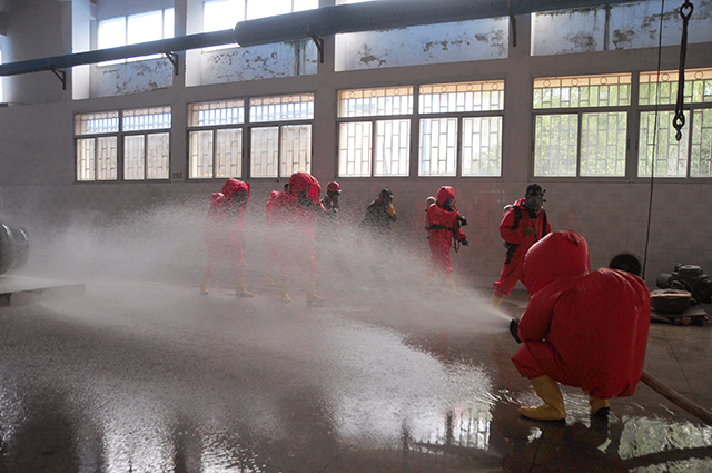 為提高涉氯從業(yè)人員的安全防范意識和應急處理能力,根據(jù)《安全生產法》和《危險化學品安全管理條例》法律法規(guī)要求, 6月25日下午,黃石市自來水公司在花湖水廠內舉行了液氯泄漏事故應急救援演練。黃石港區(qū)安監(jiān)局局長陳繼友、黃石港分局分管花湖水廠片區(qū)安全工作的有關負責人受邀觀摩了應急演練。公司所屬的涼亭山水廠、王家里水廠、花湖水廠、下陸加壓站和黃石消防隊一同實戰(zhàn)演練。