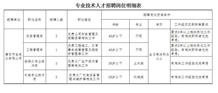 黃石市自來水有限公司專業(yè)技術(shù)人才招聘公告