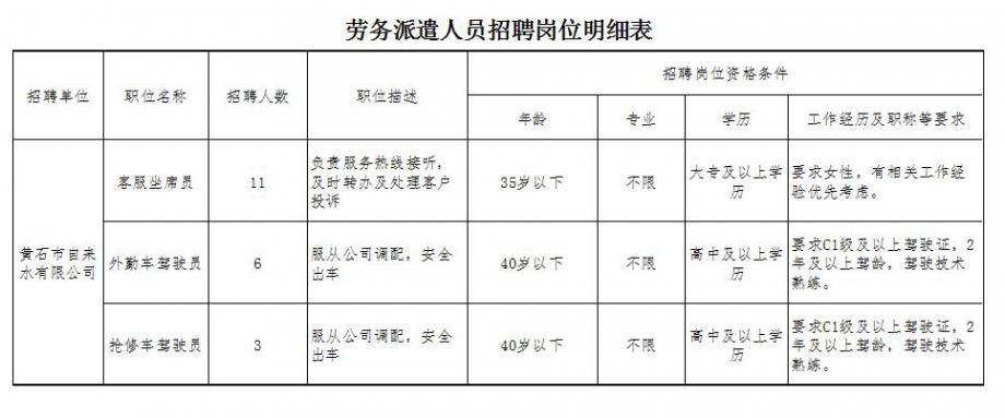 報名者應(yīng)符合《黃石市自來水有限公司勞務(wù)派遣人員招聘崗位明細表》(以下簡稱《崗位表》)規(guī)定的年齡、專業(yè)、學(xué)歷等各項要求。