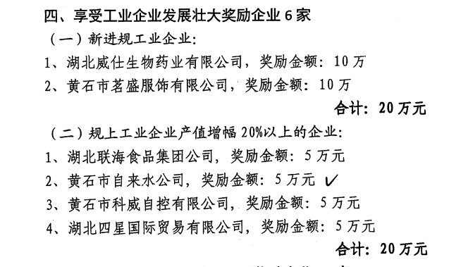 4月15日,市自來水有限公司獲得黃石港區(qū)人民政府發(fā)放的工業(yè)企業(yè)發(fā)展壯大獎(jiǎng)金5萬元整,以獎(jiǎng)勵(lì)該公司作為規(guī)上企業(yè)在2019年度產(chǎn)值增幅達(dá)到20%以上的成績,黃石港區(qū)共有4家單位獲此榮譽(yù)。