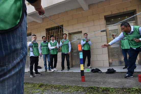 此次戶外拓展訓(xùn)練項目以團隊協(xié)作為主要形式,集娛樂與競賽于一體。干部職工們首先被隨機分成六個組,隨后經(jīng)過小組集體討論,確定了各自的隊長、隊名、隊歌、口號、隊型,并進行了展示。