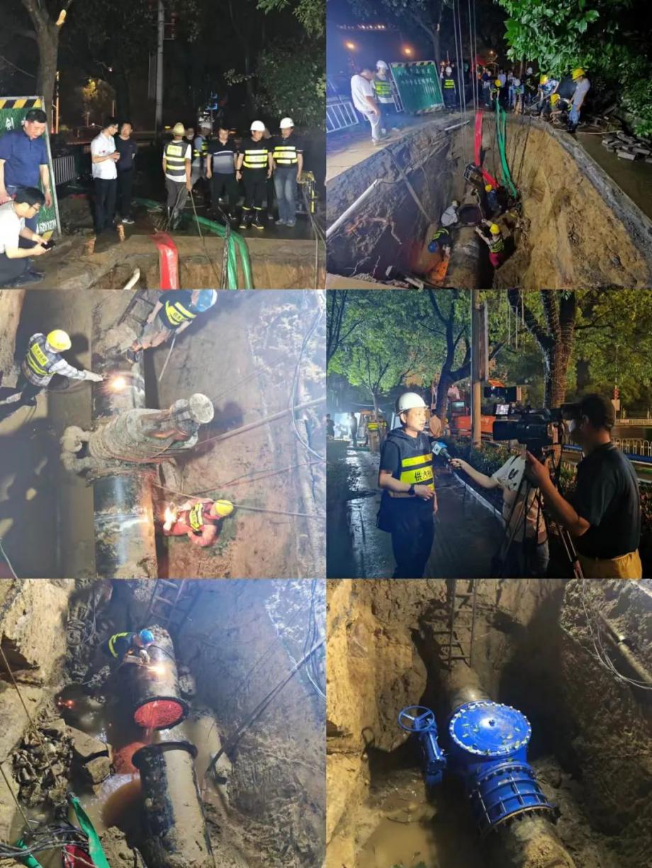 夜幕降臨,搶修現(xiàn)場熱火朝天,公司領導們與搶修人員共同奮戰(zhàn),安排部署搶修設備、物資。晚上21點,天氣突變,面對突如其來的降雨,搶修人員拿起雨衣分成兩組,立馬趕往施工地點,各盡其職,分頭行動,冒雨維修,閘門更換、干管搶修工作齊頭并進,有序展開。