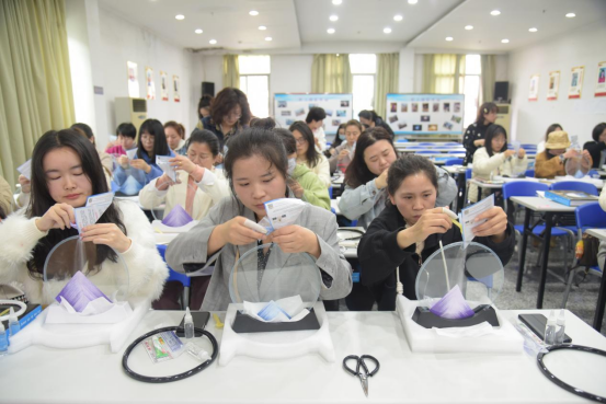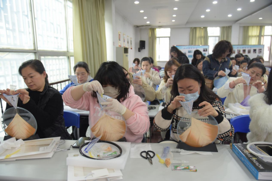 女職工們或是專心注入細(xì)沙,或是嘗試用多種顏色細(xì)沙混合放入,細(xì)沙因?yàn)榱Χ取?shù)量的不同,顯現(xiàn)出形態(tài)各異、造型別致的形狀。大家認(rèn)真地投入自己的創(chuàng)作中,不時欣賞著身邊人的畫作,精心設(shè)計(jì)間,“橫看成嶺側(cè)成峰,遠(yuǎn)近高低各不同”,翻轉(zhuǎn)玻璃,彩色石沙在兩片玻璃間緩緩流動,慢慢沉淀成另外一副模樣,這正是流沙畫的魅力所在。
