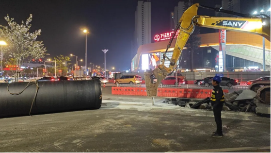 由于該施工現(xiàn)場屬于城市要道,車輛、來往行人多,交通壓力大,施工必須趕在夜間完成,早上6點前需要開放交通,施工時間極其緊迫。為盡快還路于民,減小對市民上下班及生活的影響。前期,市水務集團工程公司多次組織技術人員深入現(xiàn)場勘察,科學研判,制定詳細的遷改方案。當晚22時,交通圍堵完成后,工程公司組織精兵強將,增配多臺機械設備同時投入戰(zhàn)斗。