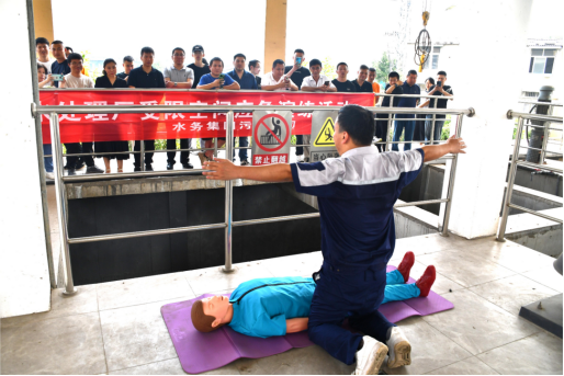 污水處理公司副經(jīng)理袁建軍同志作為指揮長宣布演練開始?;êS內(nèi)兩名巡視人員開始在高效沉淀池污泥泵房進行巡視,途中一名巡檢人員突發(fā)暈倒情況,另一名巡檢職工立即向廠長報告并采取相應(yīng)措施,廠長請示指揮長后,宣布立即啟動花湖污水處理廠受限空間應(yīng)急預(yù)案,并組織開展救援工作。在救援過程中,各成員緊密協(xié)作,通訊聯(lián)絡(luò)暢通,應(yīng)急救援響應(yīng)迅速,現(xiàn)場指揮有條不紊,合理調(diào)配資源,搶險救援人員爭分奪秒地“救助”受傷人員,并進行現(xiàn)場心肺復(fù)蘇演練。最后,水務(wù)集團副總經(jīng)理李從陽對本次演練活動作出點評,李總提出,污水公司要進一步總結(jié)本次演練的不足之處,增強應(yīng)急預(yù)案的針對性和實戰(zhàn)性,確保一旦發(fā)生事故,能夠及時有效控制險情。