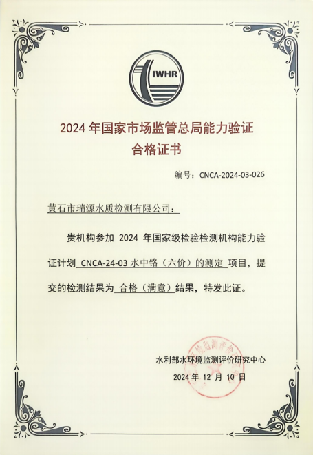 水質(zhì)檢驗(yàn)?zāi)芰︱?yàn)證是有效提高實(shí)驗(yàn)室能力的重要手段,近期生產(chǎn)運(yùn)行中心(瑞源水質(zhì)檢測(cè)公司)參加2024年國(guó)家級(jí)能力驗(yàn)證計(jì)劃“水中鉻(六價(jià))的測(cè)定”國(guó)家級(jí)能力驗(yàn)證項(xiàng)目,順利通過(guò)水利部水環(huán)境監(jiān)測(cè)評(píng)價(jià)研究中心考核,評(píng)價(jià)結(jié)果為合格(滿意)。